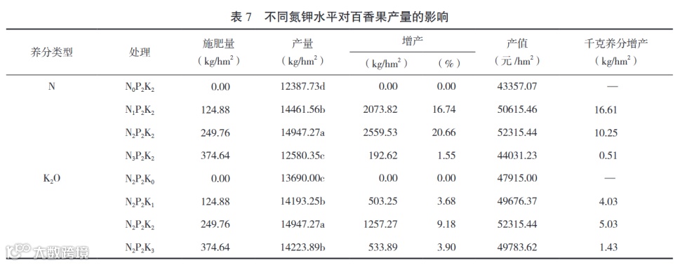 将N0P2K2、N1P2K2、N2P2K2、N3P2K2、N2P2K0、N2P2K1、N2P2K2、N2P2K3处理的施肥量及百香果产量换算成每公顷施肥量和产量。由表7看出,百香果的产量随着氮、钾肥施用量的增加均呈先增后降的趋势,且施用氮、钾肥对百香果产量均有显著影响。在磷钾施用量一致的条件下,施氮量(按N计)为124.88、249.76、374.64kg/hm2时,与N0P2K2处理相比各处理百香果产量分别增产16.74%、20.66%、1.55%。