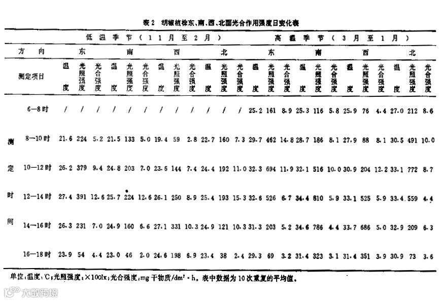 胡椒植株在低温季节光合作用强度低于高温季节,一日之中光合强度高峰值出现在12~14时或14~16时。除了温度低外,光照不足也是原因之一。应注意修剪防护林,改善光照条件,