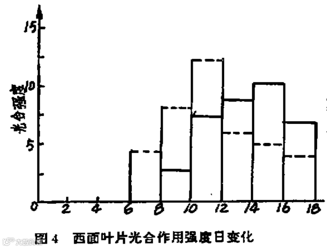植株西面叶片在低温季节和高温季节光合作用强度的日变化均有明显峰值。前者高峰值在14~16时,后者高峰值则出现在10~12时(见表2,图4)。