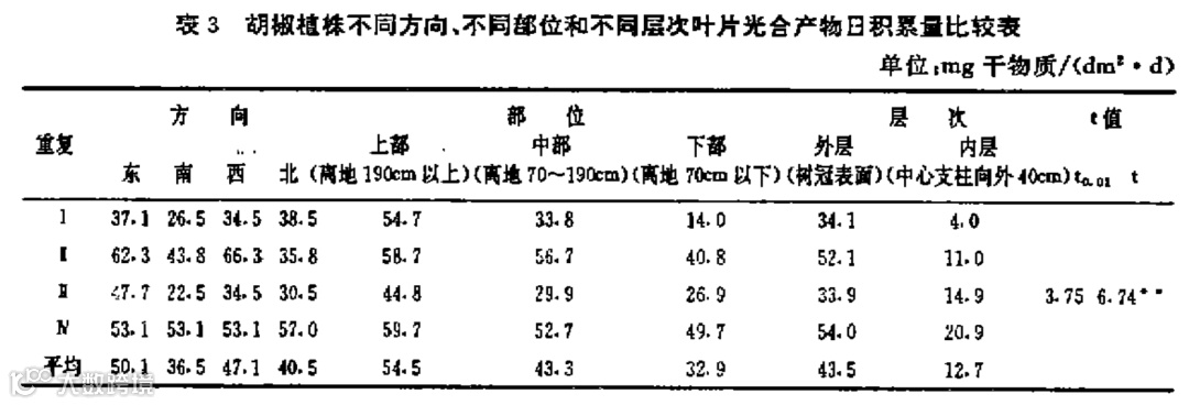 胡椒植株树冠外层叶片光合产物日积累量极显著高于树冠内层叶片光合产物的日积累量(如表3,t值为6.74)。