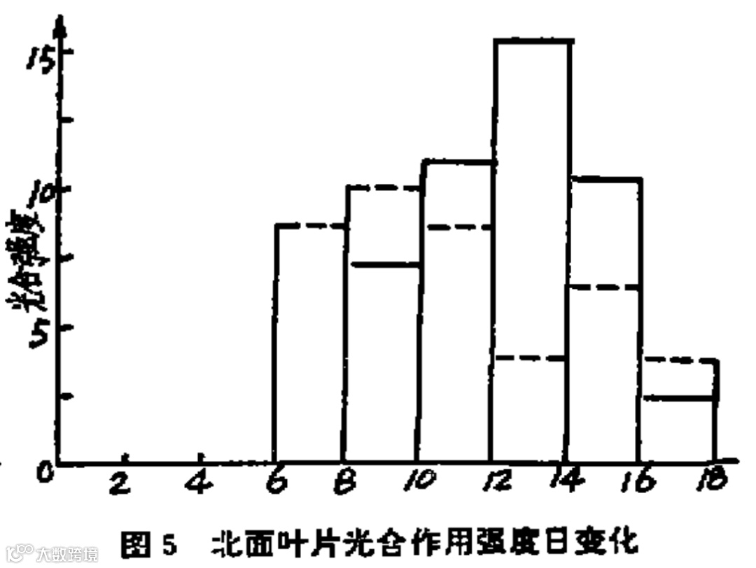 植株南面叶片在低温季节和高温季节光合作用强度的日变化均有明显峰值。前者高峰值在12~14时,后者高峰值在10~12时(见表2,图3)。