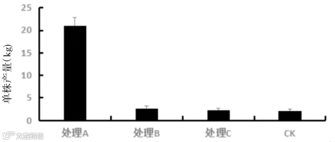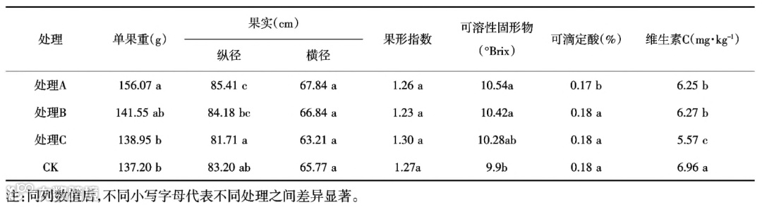 在果实可溶性固形物含量中,处理A达到最高为10.54。Brix,比对照高6.46%,处理B、C可溶性固形物含量分别为10.42。Brix和10.28。Brix。