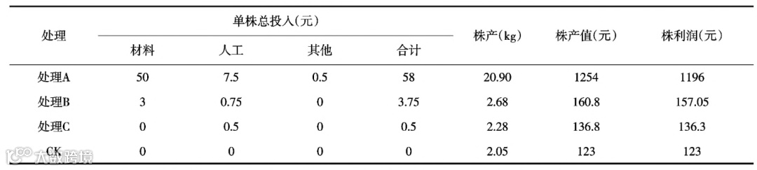 在果园生产中,处理C可就地取材,因此总成本比处理A、处理B要低,CK处理花费人工最少,总成本最低,但是产量最低,产值和利润也最低;处理A因搭遮树冠投人人工较多,但果树利润最大,每株利润达到1196元,分别比处理B、处理C和CK高1038.95元、1059.7元、1073元,经济效益显著,所以处理A应为首选推广方法。塑料膜的使用寿命一般为2~4年,若以几年分摊,成本更低,投入产出效益更明显。