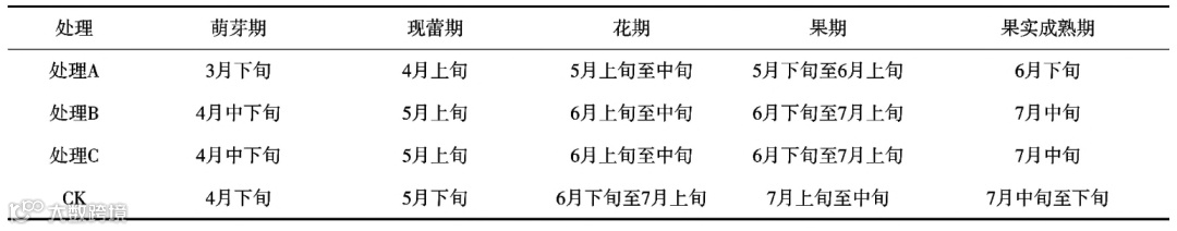 CK:果园传统处理, 清除树盘及周围杂草,保持清洁。每个处理5个重复。