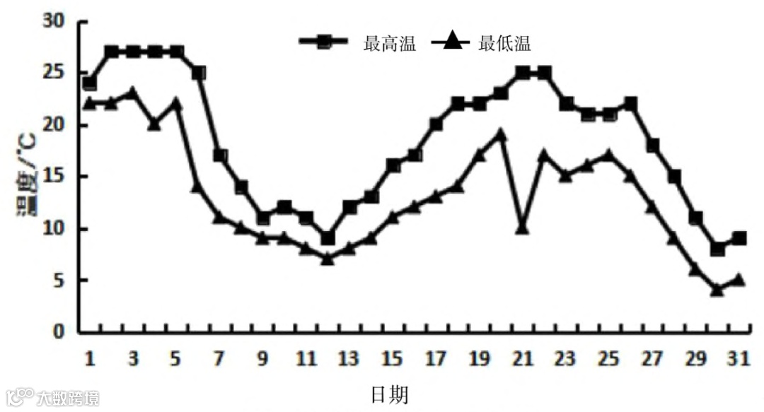 试验结果可以看出,试验基地共出现2次低温寒害现象。第一次寒害于12月8日开始发生,此时已达到影响莲雾正常生长温度10°C,此后6天连续出现低于10°C的天气,其中11日和13日达到莲雾寒害临界值8°C,12日出现7°C低温,气温回升后一周受害症状逐渐显现。