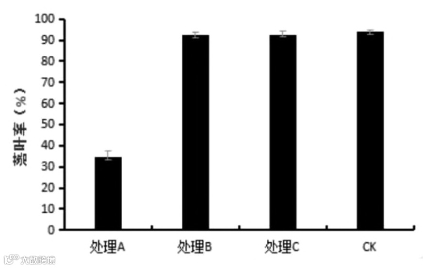 由图2明,随着最终气温稳定回升,各处理莲雾叶片的落叶率由高到低依次为CK>处理C>处理B>处理A。处理A落叶率最低,为34.43%,显著低于其他处理,其次为处理B和处理C,落叶率分别为92.34%、92.46%,两者差异不显著;CK落叶率最高为93.78%。整个冬季不同覆盖下莲雾落叶情况说明树冠覆盖有明显减轻低温寒害的作用(图2)。