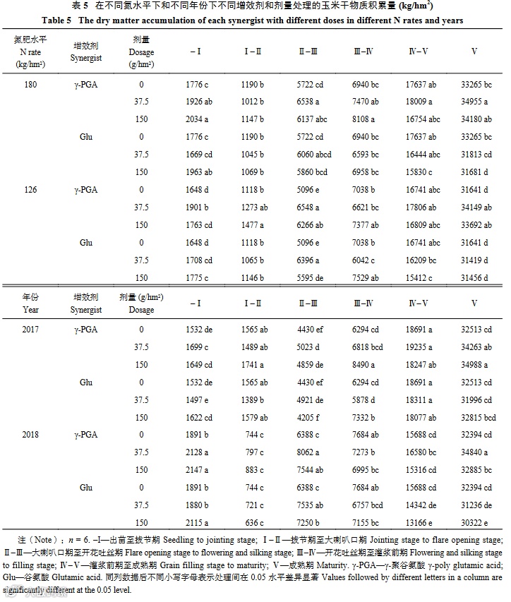 表5结果表明,低量喷施γ-PGA均可明显提高干物质积累总量,且主要促进大喇叭口期至开花吐丝期的积累;而高剂量处理仅在2017年明显提高干物质积累总量,主要促进夏玉米开花吐丝期至灌浆前期的干物质积累。