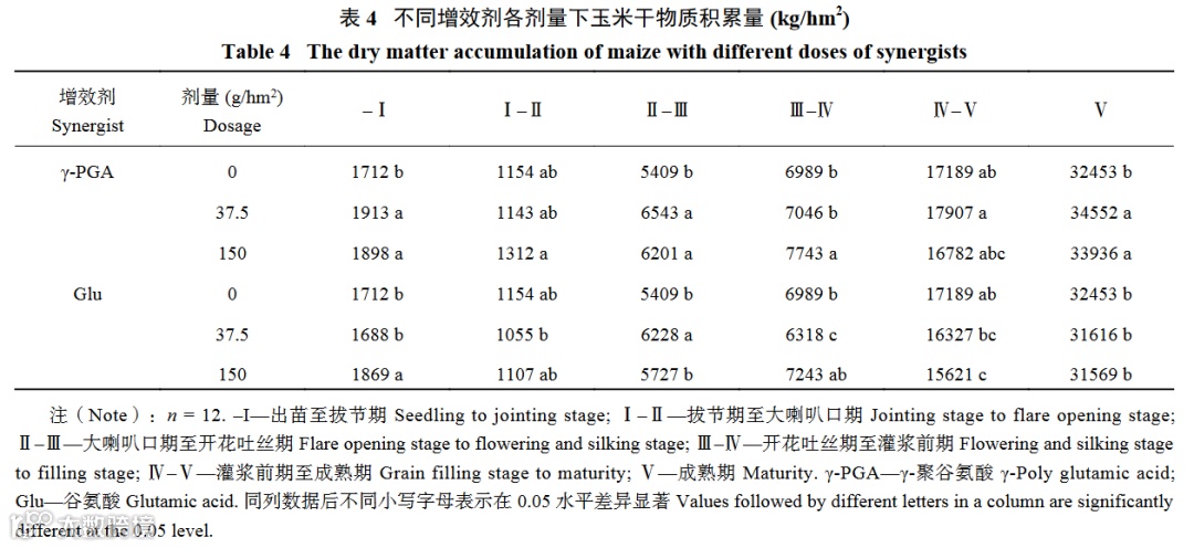 表4结果表明,不同增效剂间,喷施γ-PGA处理干物质积累总量显著高于谷氨酸处理。不同增效剂下的不同剂量间也存在差异,喷施低量和高量γ-PGA处理的成熟期干物质积累量均显著高于清水对照,增幅分别为6.47%、4.57%,两剂量间无显著差异。