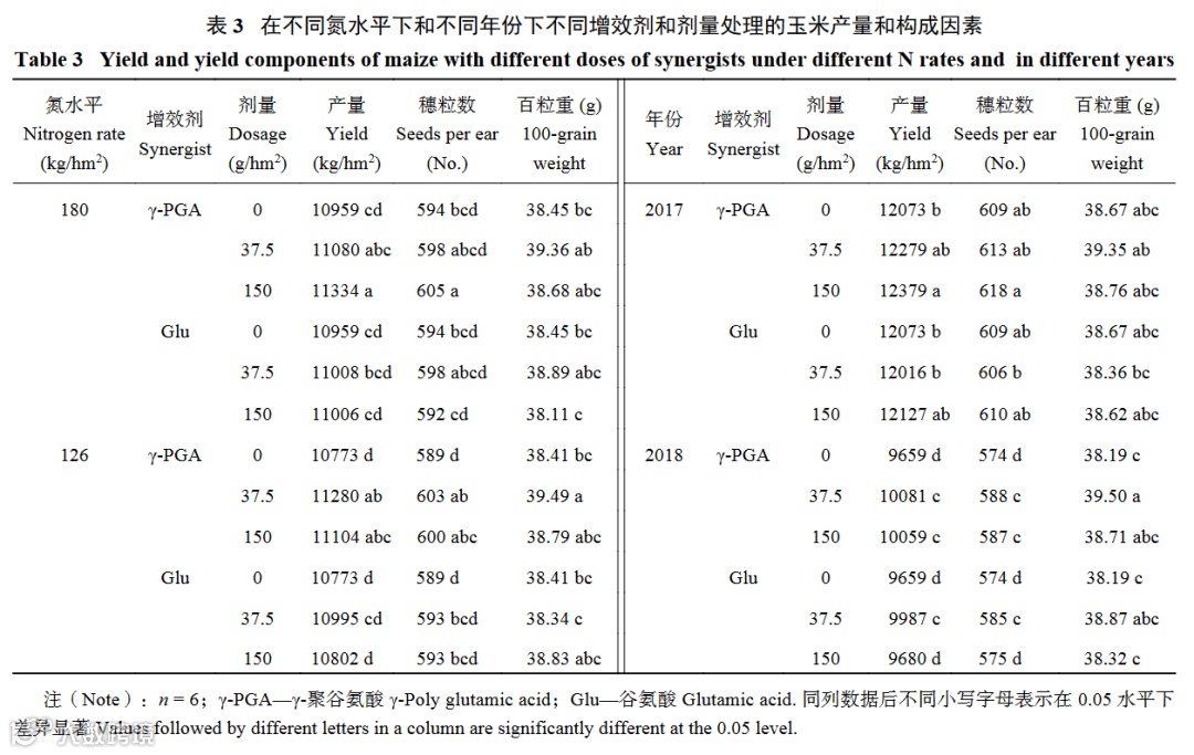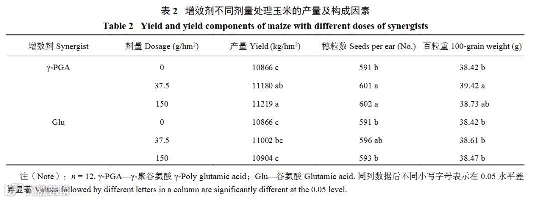 1. 喷施γ-PGA促进夏玉米开花前后干物质积累,提高干物质和养分积累总量,增加穗粒数提高产量,在减量30%施氮时,喷施γ-PGA的增效作用优于常规施氮。
