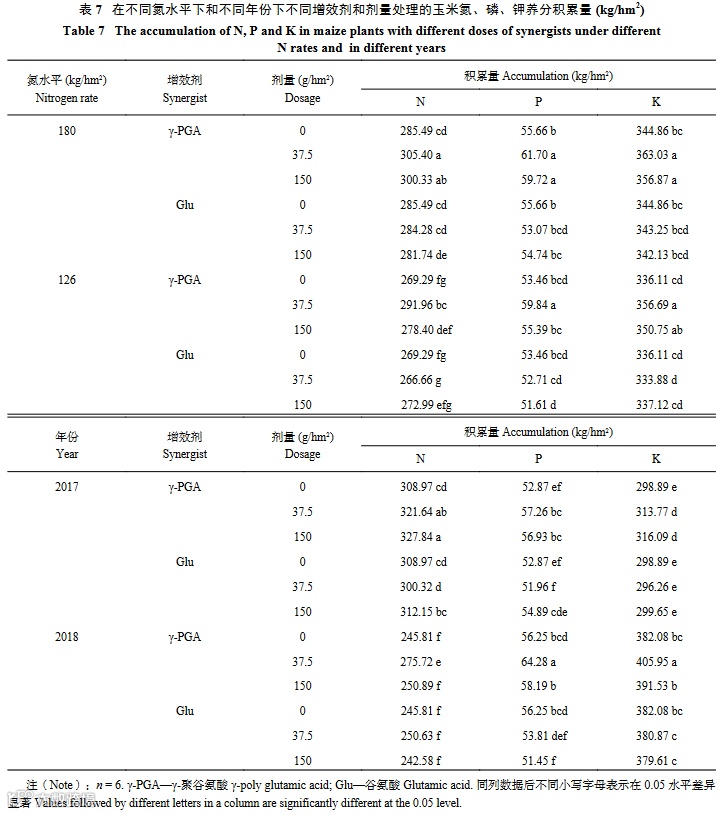 夏玉米氮磷钾养分积累总量的方差分析结果表明 (表1),不同增效剂、剂量及二者之间的交互作用均对氮磷钾积累总量有极显著影响 (P < 0.01)。不同增效剂间表现为喷施γ-PGA显著高于谷氨酸处理,增幅分别达6.37%、11.56%、5.23%,且不同剂量在不同增效剂下表现各异 (表6),喷施γ-PGA能明显提高夏玉米的氮磷钾养分积累总量,且效果好于谷氨酸。