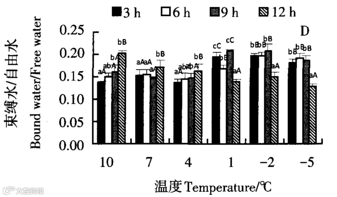 图D 低温胁迫对莲雾叶片束缚水/自由水比值的影响