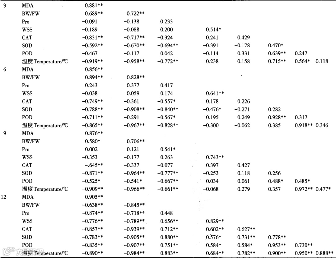 低温胁迫过程中各项抗寒生理指标的相关性分析由表2可看出,在低温胁迫下,细胞膜质过氧化加剧,MDA含量增加,电解质外渗,而CAT、SOD、POD、束缚水、保护作用。脯氨酸及可溶性糖在胁迫不同阶段起到不同程度的保护作用。
