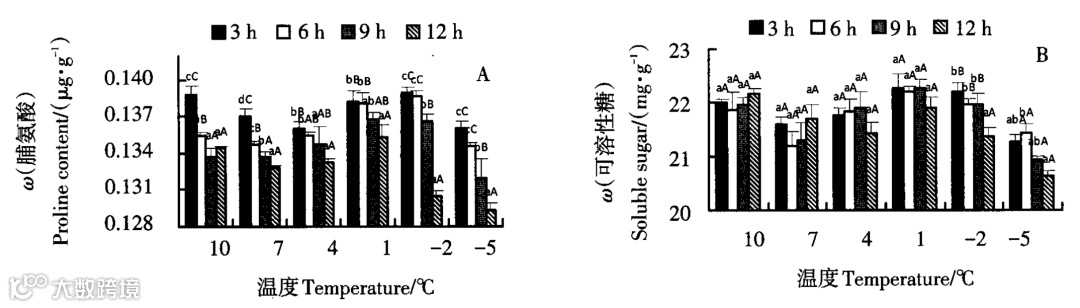 低温胁迫对细胞保护物质(Pro、WSS)含量的影响不同低温下,随低温时间的延长,叶片Pro含量总体呈不断下降趋势。(图2-A)
