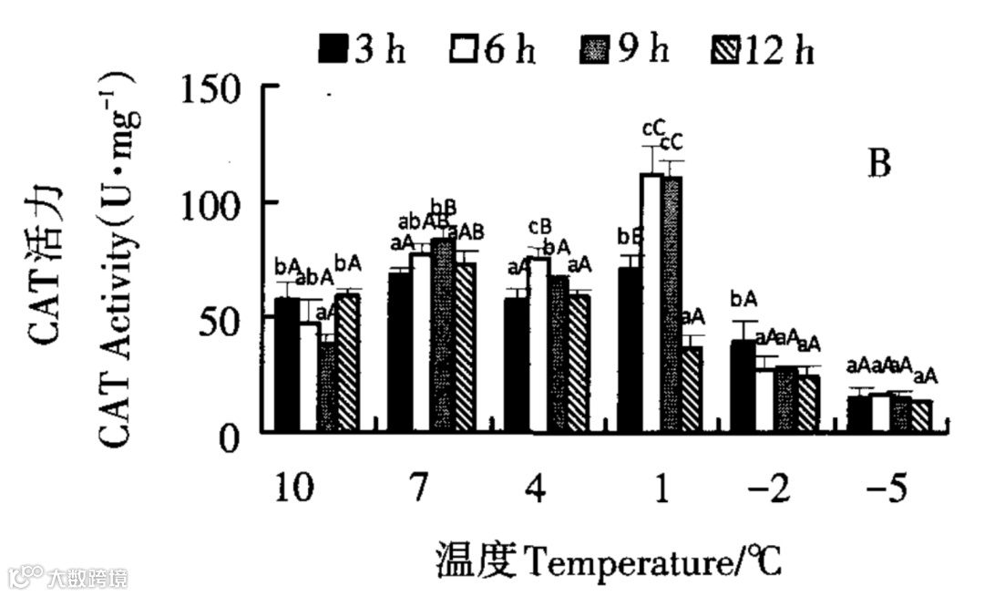 随处理时间的延长,不同低温下叶片CAT活性有3种变化趋势(图2-B)。CAT活性随温度下降总体呈升一降一升一降的“M”型变化,在7和1°C处活性上升,在4°C处活性下降,10、7、4和1°C下活性总体高于-2和-5°C。