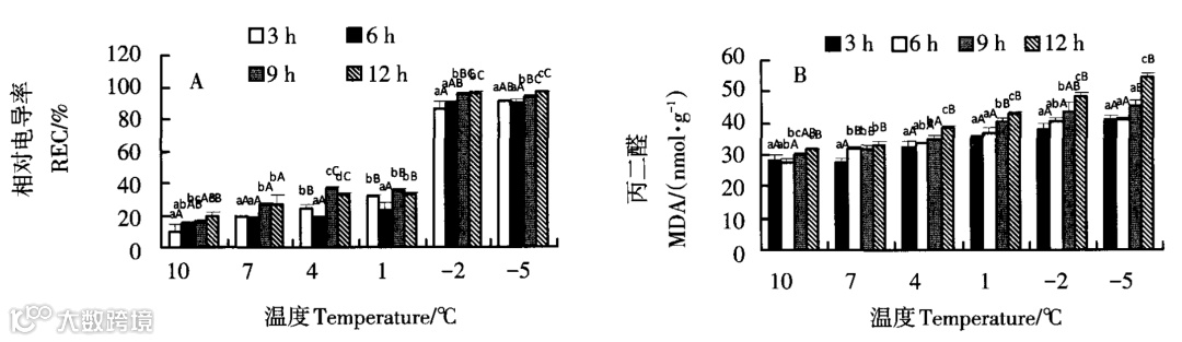 从数据(图1-A)可看出,4个时间处理的REC均随温度的下降而上升,呈明显的“s”型曲线。-2°C时细胞开始出现冻伤,细胞内的电解质大量外渗,表现出高渗出率。