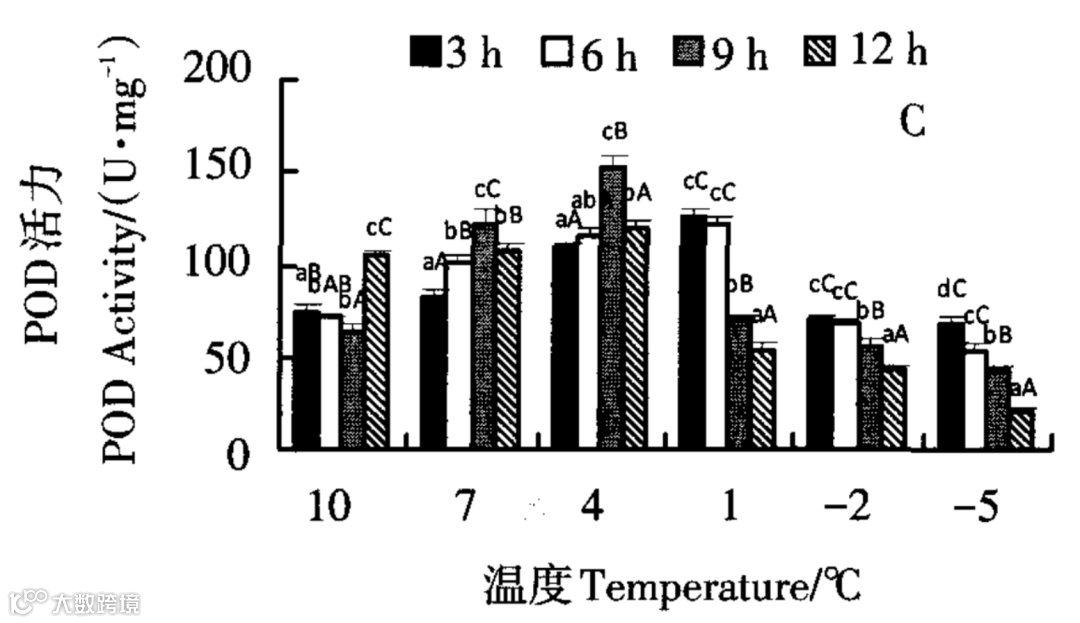 不同低温下,叶片POD活性随处理时间的延长呈3种变化趋势(图2-C)。POD活性在10°C处理12h,7、4℃处理3、6、9、12h和1°C处理3、6h时,POD活性较高,其中1°C处理6-9h是POD活性由强变弱的跃变转折点,为等温条件下POD活性变幅最大。