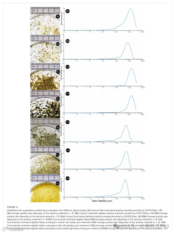 图6.对不同藻类样品进行定性和定量粒度评估。(一)SAMS提供的磨碎的 Alaria esculenta 起始材料 (Ib) 起始材料的平均粒径分散度 (n = 3)。(二一)SAMS提供的地面海带起始材料 (IIb) 起始材料的平均粒径分散度 (n = 3)。(三一)SAMS提供的磨碎的 Saccharina latissima 起始材料 (IIIb) 起始材料的平均粒径分散度 (n = 3) (IVa) 商业海带片 (IVb) 起始材料的平均粒径分散度 (n = 3)。经过研钵和研杵预处理(Vb)的市商业海带片起始材料的平均粒径分散度(n = 3)。(VIa)经过球磨机研磨预处理(VIb)的商用海带片 起始材料的平均粒径分散度(n = 3)。(七)商业海带片经过水基高剪切混合预处理(VIIb)起始材料的平均粒径分散(n = 3)。