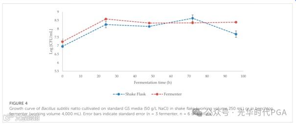 在放大阶段,培养体积从250 mL增加到4,000 mL似乎对枯草芽孢杆菌纳豆菌细胞生长或活力没有显着影响(p > 0.05)(图4)。