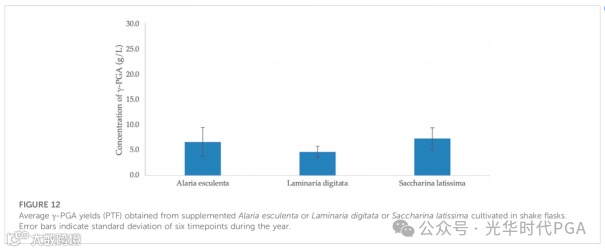 培养了由Alaria esculenta或Laminaria digitata或Saccharina latissima组成的培养基,用于γ-PGA生物合成。尽管γ-PGA产量的变化很明显(参见图12中的标准差条),但统计分析表明,三种大型藻类之间的γ-PGA产量没有显著差异(p = 0.11)。如之前的图10所示,γ-PGA产量在年度时间点上没有显著差异。