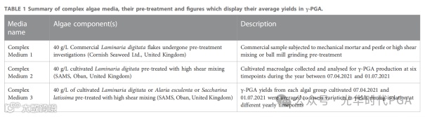 众所周知,海藻是碳水化合物、蛋白质、抗氧化剂和纤维物质的绝佳来源;英国海岸特有的海带、Saccharina latissima 和 Alaria esculenta 是三种全年生长的大型藻类物种(图 2),虽然它们都是棕色海藻家族的一部分,但在碳、抗氧化剂、蛋白质物质和灰分/成分方面都表现出很大差异。为此,我们评估了不同藻类对枯草芽孢杆菌纳豆菌γ-PGA产量和化学成分的影响。还评估了栽培期间(4月至8月)发生的聚合物生化变异对枯草芽孢杆菌纳豆菌γ-PGA生物合成的影响。