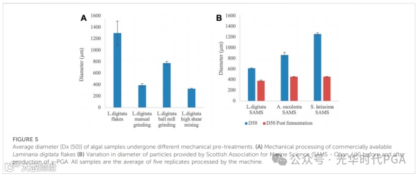 分析藻类组分的初始和机械处理后的粒径,以评估培养过程中养分可用性的潜在变化。不同颗粒的直径已在图5、图6中显示。