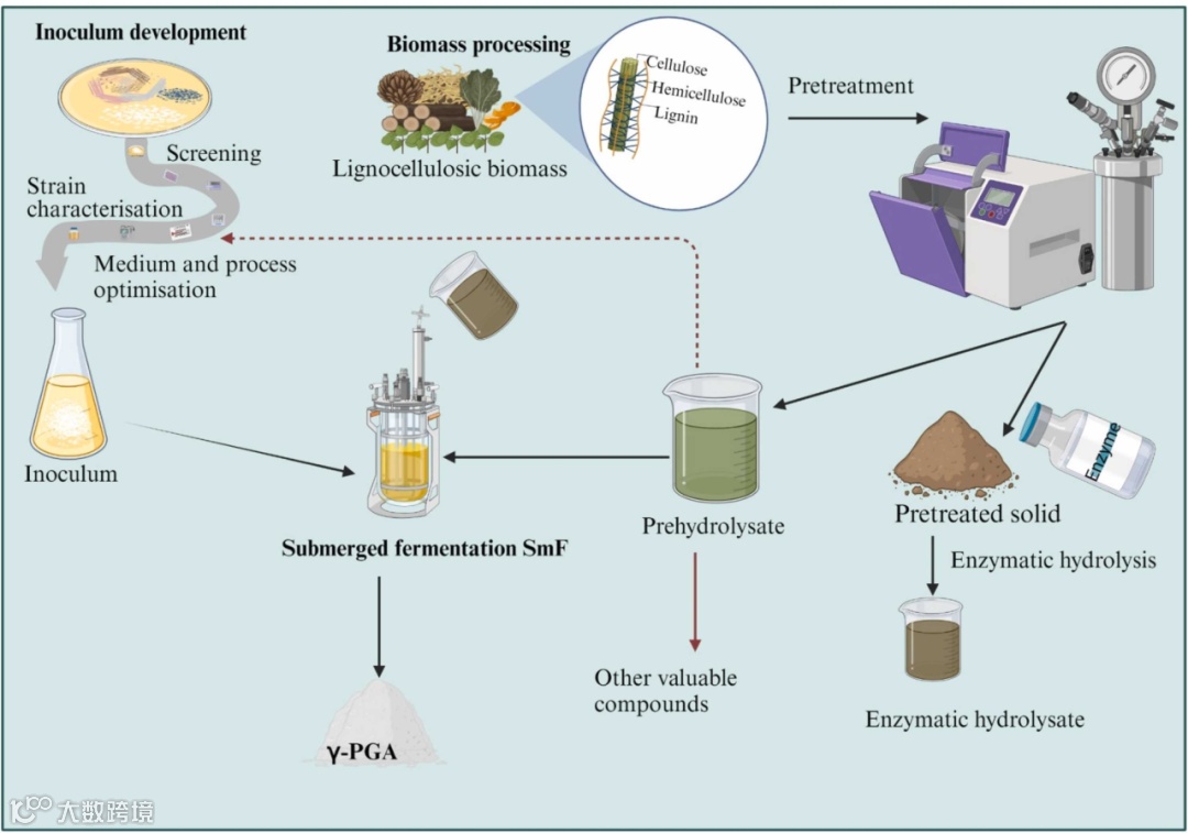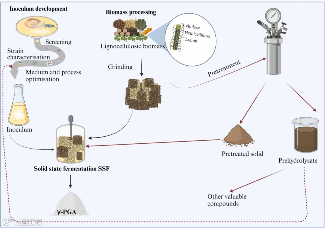 木质纤维素γ-PGA的生产是通过浸没发酵或固态发酵实现的。虽然工艺流程略有不同,但两条路线的一般工艺涉及以下两个或多个步骤:生物质制备和表征、生物质预处理、酶促糖化、微生物菌株的选择和培养、发酵用于 γ-PGA 生产、γ-PGA的回收和纯化、γ-PGA的表征、γ-PGA的应用。