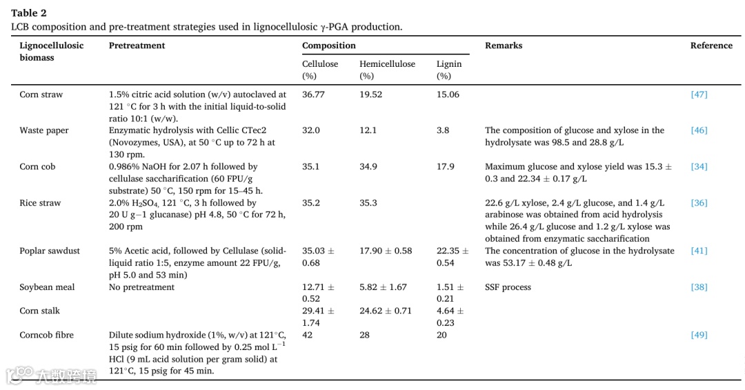 一些木质纤维素生物质(LCB)已被用作γ-PGA生产的原料,包括农业副产品、林业副产品、工业废物和食品加工副产品(表2)。所选择的原料主要影响产量和生产成本,主要体现在LCB的购置成本、糖成分和加工成本方面。LCB通常被认为是一种丰富、低成本和可再生的原料,使其对生物精炼工艺具有吸引力。对于大多数研究,大约40-70%的LCB由聚合糖组成(表2)。此外,使用LCB可以降低约85%的γ-PGA生产成本,因为这些原料具有高糖成分,并且大多是副产品或废物,购置成本很少甚至为零。