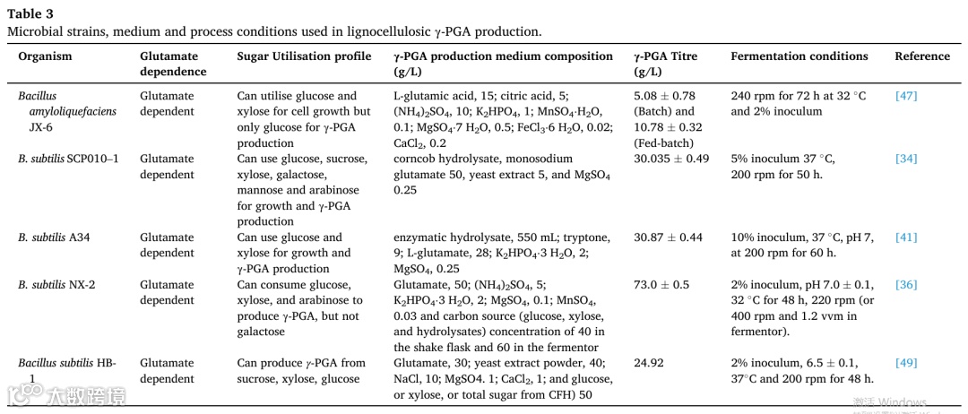 γ-PGA主要由枯草芽孢杆菌属的细菌种类产生,如枯草芽孢杆菌、地衣芽孢杆菌、淀粉芽孢杆菌,所使用的微生物菌株可以影响木质纤维素γ-PGA的产生。枯草芽孢杆菌菌株ZJU-7经过测试和优化,用于木糖分批发酵γ-PGA。肉汤的产量和产率分别约为28.15 g/L γ-PGA和0.74 g/L/h。使用含多种糖的底物的进一步研究结果为24.92 g/L,淀粉样淀粉B.淀粉碎机C1也表现出通过依次消耗混合物中的葡萄糖和木糖来产生γ-PGA的能力。菌株枯草芽孢杆菌NX-2可以从葡萄糖、木糖和阿拉伯糖中产生γ-PGA,但不能从半乳糖中产生(表3)。