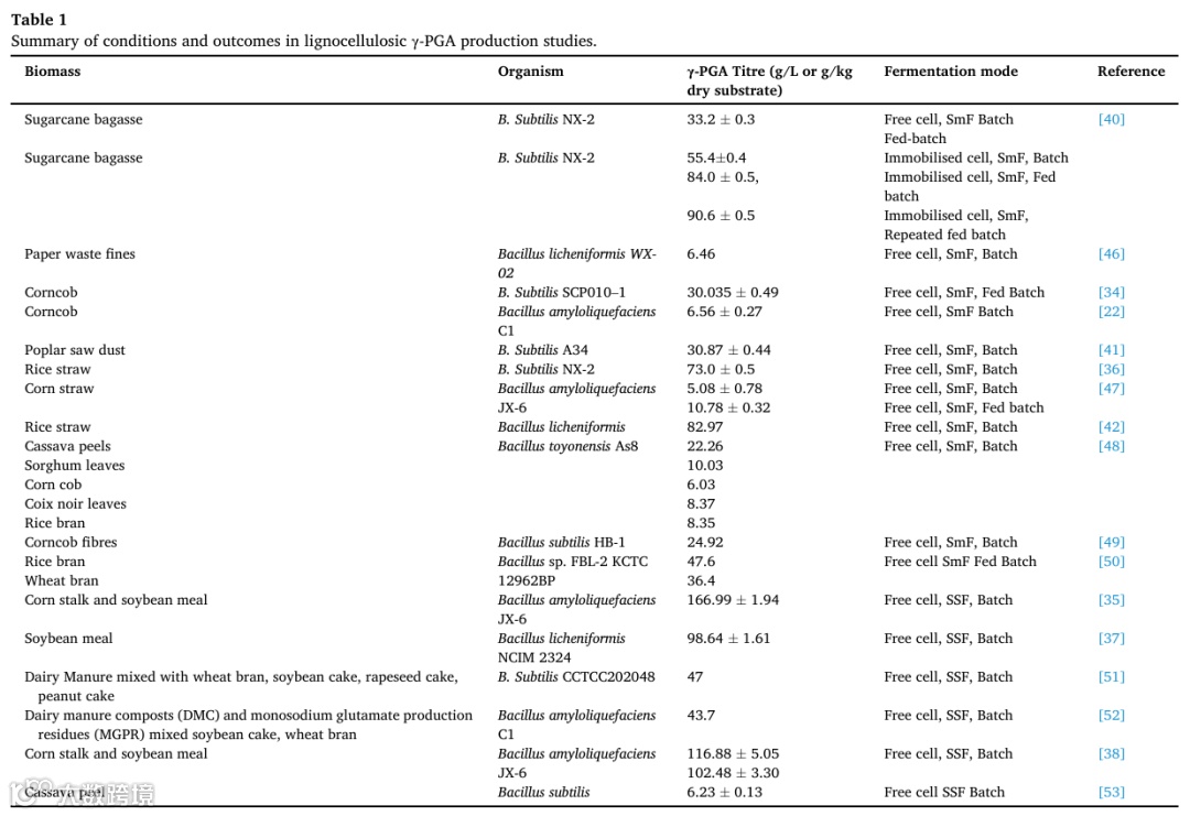 γ-PGA是响应某些环境条件和压力因素而产生的,例如营养限制,温度和pH值变化,渗透胁迫,生物膜形成,表面附着,细胞通讯或有毒化合物的存在,因此没有理论产率。据报道,SmF和SSF研究的干固体产量分别在5-91克/升和6-166克/千克之间(表1)。这种广泛的γ-PGA产量归因于可用的碳源、微生物菌株从可用的碳源生产化合物的能力、发酵条件和回收方法。