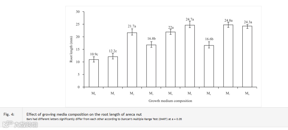 处理M中的根长5=24.7厘米,M2=21.7厘米,M4=22厘米,M7=24.8厘米和M8=24.3厘米。虽然对照处理中的根长(M0)为10.9厘米。与对照组相比,根长的增加达到了99-127%的范围。同时,使用100%土壤介质的根长最低(图4)。槟榔在生长介质成分的各种处理中的生长性能如图5所示。
