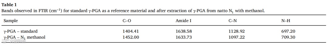 表1显示了在FTIR中观察到的标准γ-PGA的条带(图4a)和从纳豆N中提取γ-PGA后获得的生物产物与甲醇(图4c)。