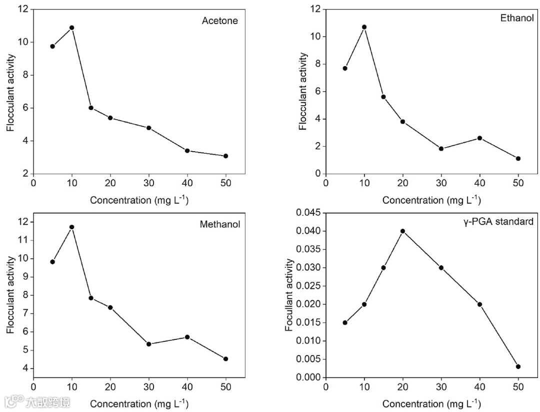 从丙酮、乙醇和甲醇中提取的γ-PGA的絮凝行为相似(图5),但从甲醇中提取的γ-PGA的絮凝活性略好。如图5所示,絮凝剂活性的最佳浓度为10mg/L,显示以下值的减少。这种行为在所使用的三种溶剂上是相似的,其中显示最高效率的浓度为10mg/L对于三种溶剂。该浓度下,甲醇萃取γ-PGA的絮凝率为92.9%,丙酮为92.4%,乙醇为89.52%。