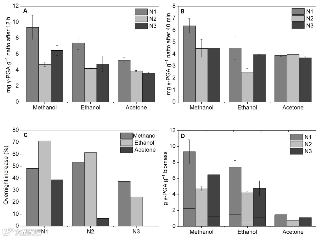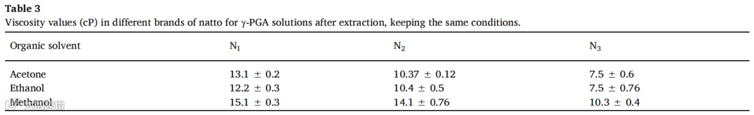 纳豆N1使用甲醇作为溶剂的粘度值最高(表3)。在测试的三种纳豆中,N1是γ-PGA含量最高的产品,甲醇在提取过程中的效率最高。使用甲醇作为沉淀剂可能影响了溶液的剪切速率。由于粘度与溶液中存在的溶质的分子量有内在的联系,由于分子量越大意味着粘度的阻力越大,因此该分析的结果使我们能够推断出在纳豆N1的情况下,γ-PGA的分子量可能比其他两种研究的纳豆具有更高的值。
