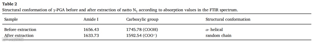 在纳豆N1的FTIR中,酰胺I键的特征峰长度为1656.43cm,在 γ-PGA 中提取N1后使用甲醇,在1633.73cm的波段内鉴定出酰胺I基团,酰胺I的这些吸收值,以及指示羧基侧基的电离值,使我们能够推断γ-PGA的结构构象在提取纳豆N1的过程后发生了变化(表2)。