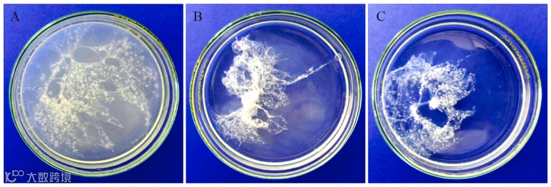 图 3.使用溶剂在溶液中存在γ-PGA的瞬时净形成特征:(A)丙酮;(B)乙醇;(C)甲醇