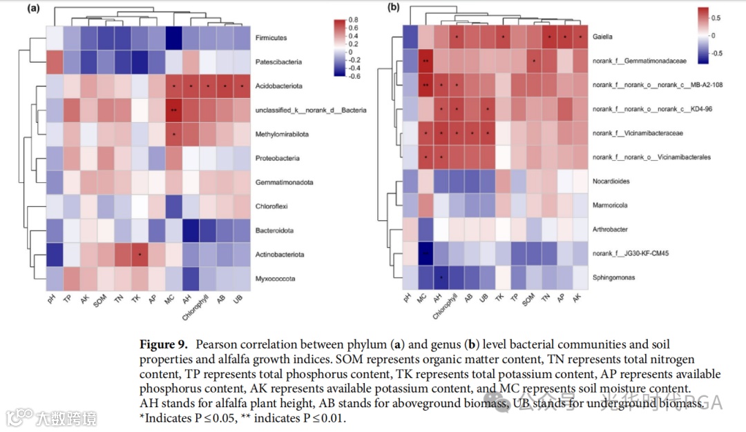 门水平分析显示,土壤全K与放线菌门呈显著正相关。此外,土壤含水率与Acidobacteriota、unclassified_k__norank_d__Bacteria和 Methylomirabilota 之间存在显著的正相关。此外,紫花苜蓿中酸杆菌的丰度与生长指标株高、叶绿素、地上地下部含水量呈显著正相关。酸杆菌丰度的增加促进了紫花苜蓿的生长(图1、图9a)。