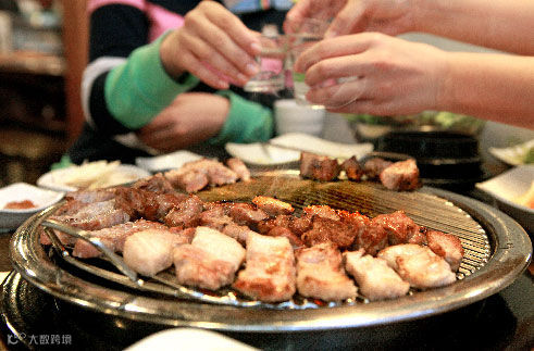 韩国人用小玻璃杯喝烧酒,而且通常是就着食物一起喝。他们喝酒非常热闹,频繁碰杯并大声说着各种祝酒词,然后一饮而尽。在晚上,你还会常常会看到一群人唱完卡拉OK后,步履蹒跚地走在大街上,笑着、唱着并争论着什么。