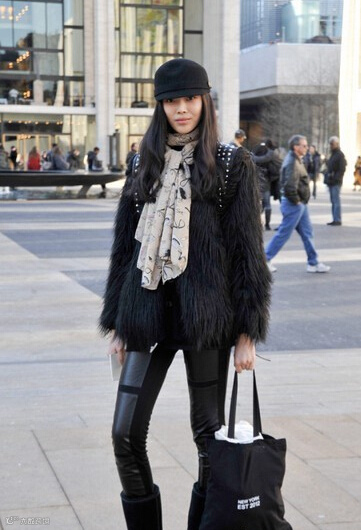 搭配要点:黑色皮草外套+黑色紧身皮裤+黑色雪地靴+黑色圆帽+黑色手提包+裸色印花围巾