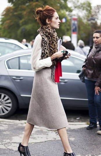 搭配要点:白色微透衬衫+米灰色包臀铅笔裙+黑色镂空鱼嘴高跟鞋+棕色豹纹围巾