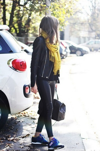 搭配要点:黑色打底衫+黑色紧身皮裤+黑色机车皮衣+深蓝色运动鞋+黑色手提包+黄色流苏围巾