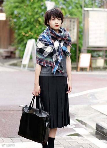 搭配要点:灰色T恤+黑色百褶半身裙+彩色格纹围巾+黑色短袜+红色平底鞋+黑色手提包