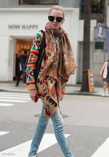 搭配要点:灰色打底衫+浅色紧身牛仔裤+民族风毛衣开衫+白色帆布鞋。