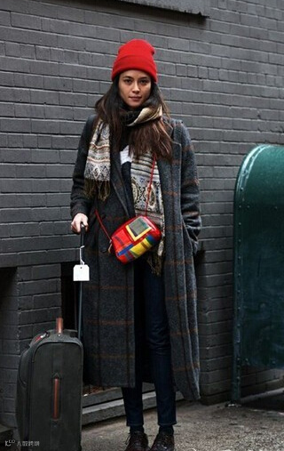 搭配要点:白色条纹T恤+深蓝色紧身裤+灰色格纹大衣+酒红色牛津鞋+红色毛线帽+印花流苏围巾