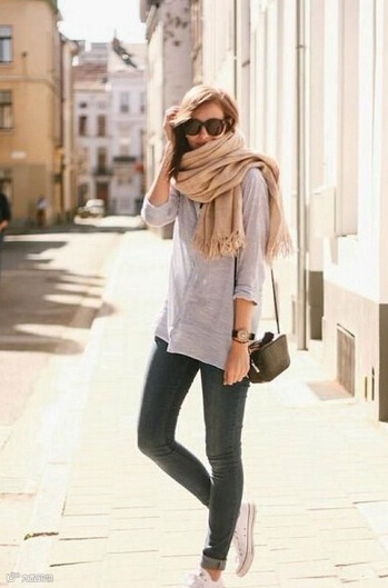 搭配要点:灰色长袖T恤+黑色紧身牛仔裤+白色帆布鞋+裸色流苏我家+黑色迷你挎包