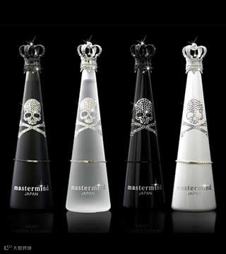 日本骷髅大牌Mastermind JAPAN与Fillico联名推出4款奢华瓶装水,水瓶上共使用200颗施华洛世奇水晶,瓶身为手工镶嵌的mastermind骷髅,瓶盖为精致华丽的镶钻皇冠造型,每个瓶身分别带有I love you、Congratulations、Thank you、Good luck 英文字的金属炼牌。瓶内的水同样是Fillico取自神户地下800米的花岗岩饮用水。此系列瓶装水一套售价近10万日元。