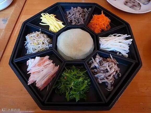宫中料理永远吸引人,“王吃什么样的饭”,除了美味之外,显然还满足了人们的八卦心理。轻巧细致的九折板是宫廷料理中最引人注目的,在9个格子的木质餐盒中,分别盛放着蔬菜和肉类等8种食物,颜色搭配得当,食用时,将放在中央的小麦薄煎饼慢慢掀起一片,每样食材都夹少许放在饼中央,包裹好蘸芥末醋酱食用。九折板清淡不油腻,色香味俱全,有主食有蔬菜有肉类,小小的9个格子,金木水火土一应俱全,仿佛一个小宇宙,提供健康的能量。