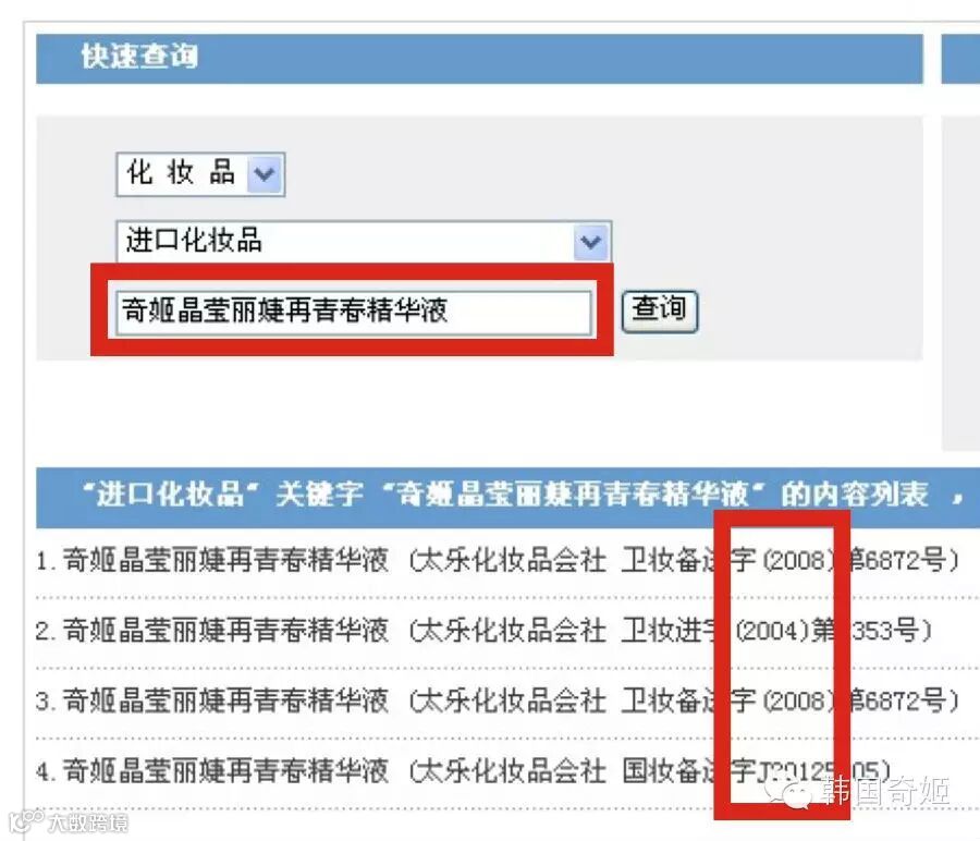 图为【奇姬晶莹丽婕再青春精华液】为例搜索出的页面,共有4条,包含了【奇姬晶莹丽婕再青春精华液】自2004年至今的所有批证;
