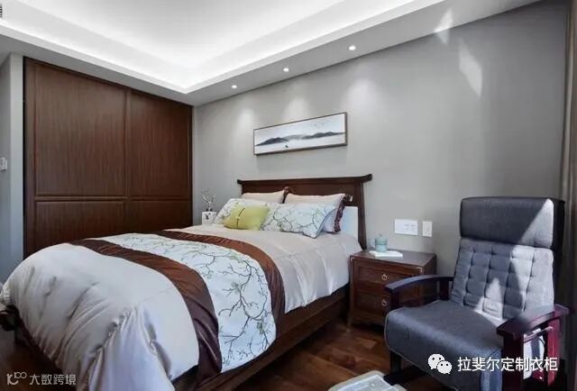 卧室延续客厅的风格特点,深色系木质床与布艺结合,舒适自然。墙面的中国风的壁画,搭配上独具东方风情的灯具作风格提炼,打造出一个简约高级的寝居空间。