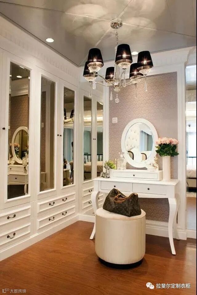 L型衣帽间的收纳空间也会比较强大,而且挂衣、折叠、饰品等分区更为科学合理,而且很多敞开式衣帽间都会将化妆台纳入其中。
