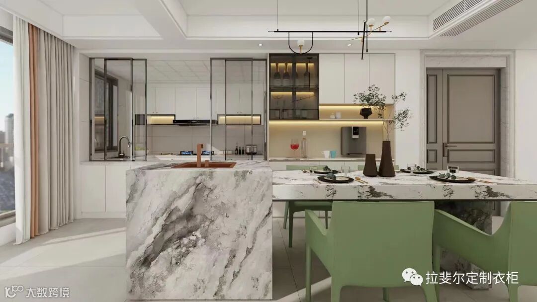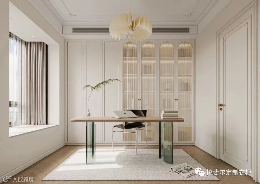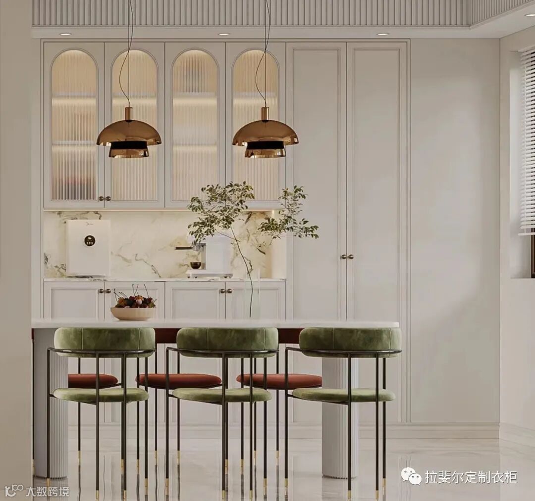轻奢风设计案例里常常能看到用玻璃做柜门的柜子,玻璃柜体通透,整体的搭配不仅给人以轻奢质感,展示性与收纳性完美结合。